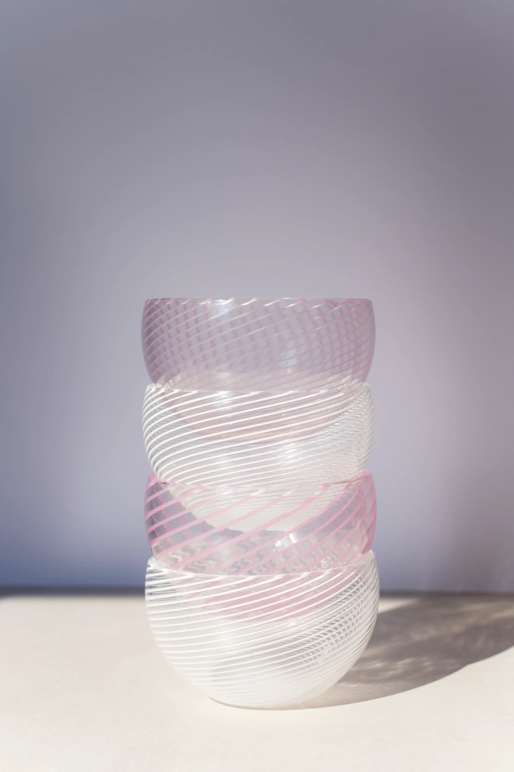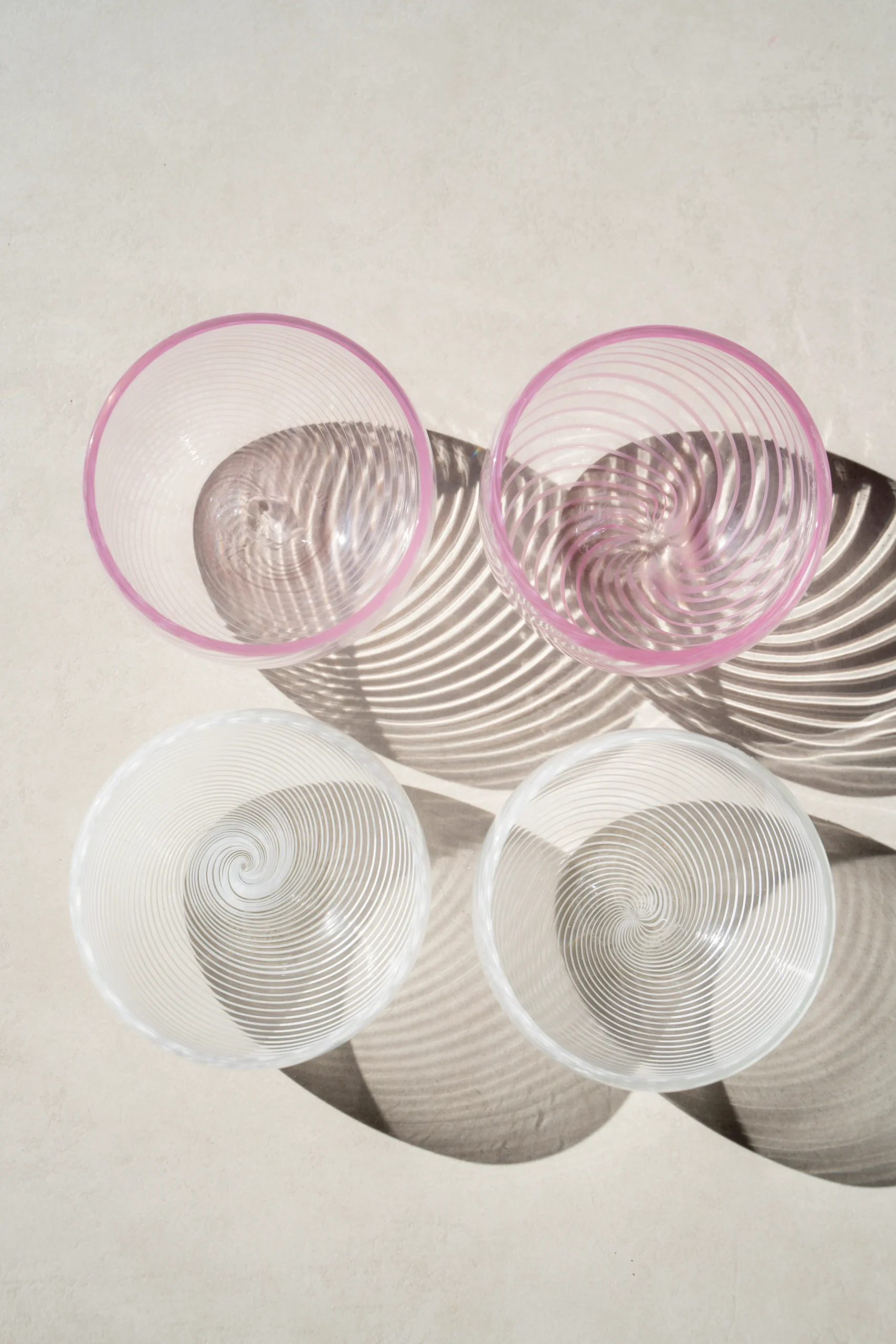 Disponibile in due tonalità, bianco e rosa, entrambe realizzate con l’antica tecnica della filigrana, che crea al suo interno un delicato disegno vitreo, come un merletto.
